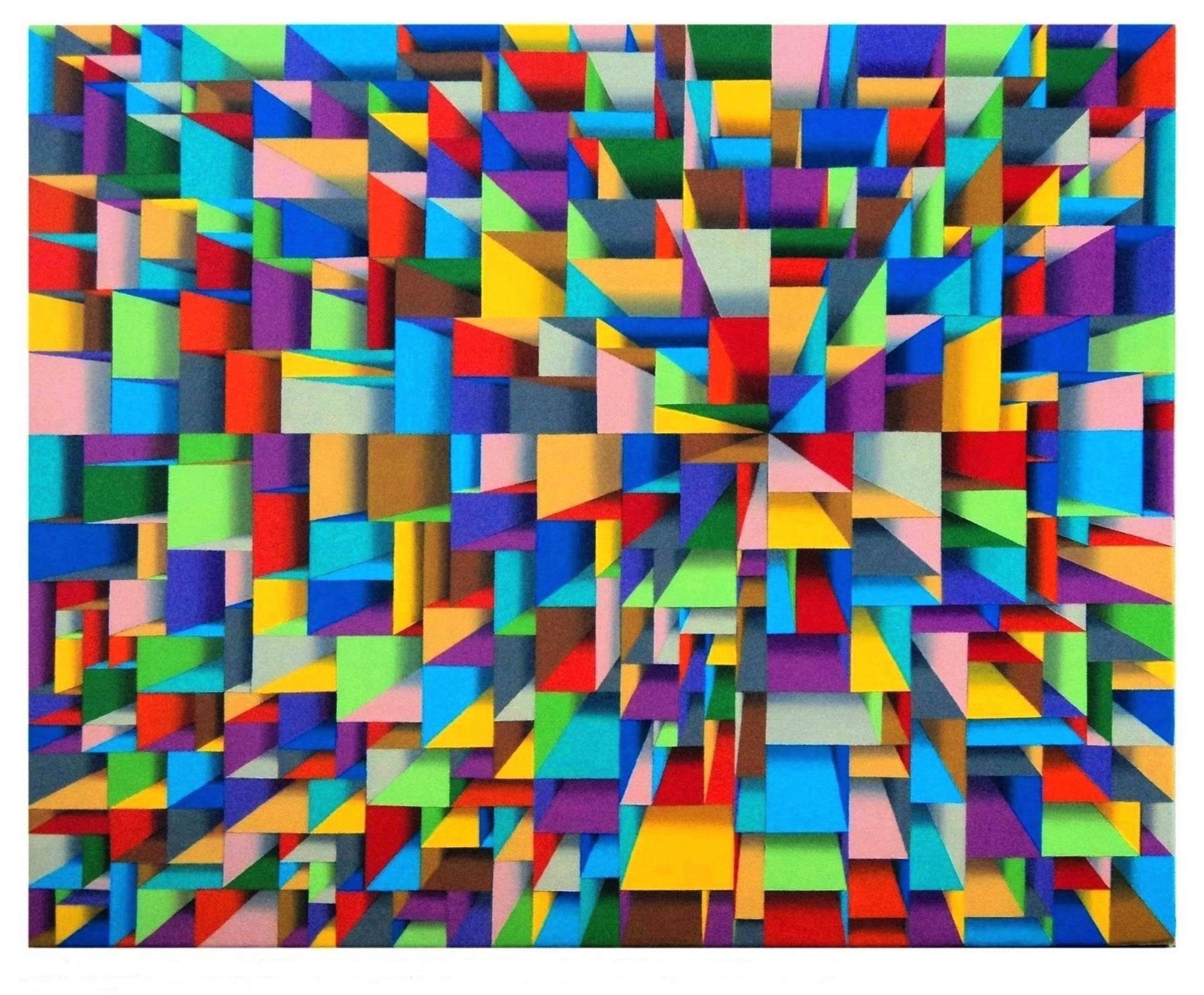 Samba Prasad Biswas is an Indian abstract artist who is deeply inspired by the rational aspects of geometric abstraction. He manipulates simple geometric shapes and structures in vivid colours and tones to create a dynamic canvas. He started his art career by creating works in a semi-figurative style. But, exposure to the works of abstract masters like Anish Kapoor and S.H.Raza helped him realise the power & beauty of pure form, shape, colour and geometry and helped him develop his own pictorial language gradually. His abstracts are predominantly inspired by architectural structures, symphony of classical Indian music, patterns & colour traditions of multiple cultures and fragments of everyday life.